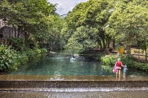 서귀포항 인근에 있는 정모시쉼터는 도민들이 사랑하는 여름 피서지로 정방폭포 상류, 울창한 숲속에 자리해있다. 제주도 3대 폭포 중 하나인 정방폭포의 물줄기가 시작되는 곳으로 사계절 내내 얼음처럼 차가운 용천수가 흐르며, 계곡에 둑을 쌓아 만든 천연 수영장이기도 하다. 수심이 얕은 구역과 깊은 구역이 나뉘어 있어 가족 단위로 물놀이를 즐기기에 적합하고 여름 성수기에는 구명조끼를 무료로 대여할 수 있고 안전요원이 상주해 있다. 한편에는 용천수에 발을 담글 수 있는 족욕 테이블도 설치되어 있다. 쉼터 옆 숲길은 정방폭포까지 이어져 숲 향기를 벗 삼아 산책을 즐기기 좋은 곳이다.
